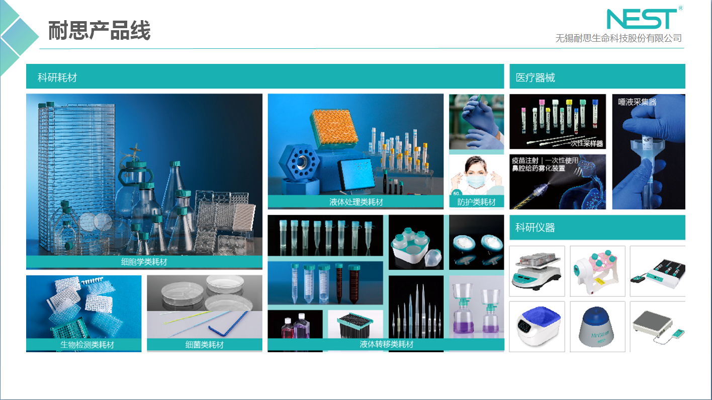 耐思NEST品牌主要產(chǎn)品分為:科研耗材、醫(yī)療器械和體外診斷三大類。耗材類根據(jù)應用領域不同,可細分為六大類:細胞類耗材、液體處理類耗材、液體轉(zhuǎn)移類耗材、生物檢測類耗材、細菌類耗材、防護類耗材。