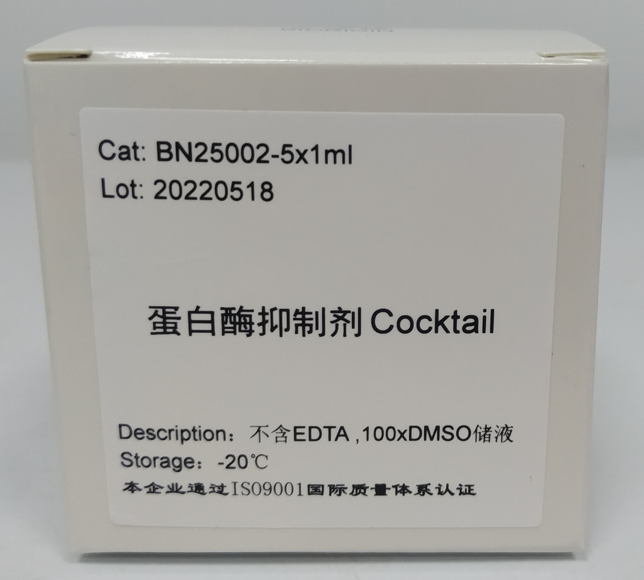 由 6 種獨立的蛋白酶抑制劑(不含 EDTA): AEBSF、Aprotinin、 Leupeptin 、Bestatin、E-64、Pepstatin A 按照優(yōu)化的配比配置而成的蛋白酶抑制劑混合物