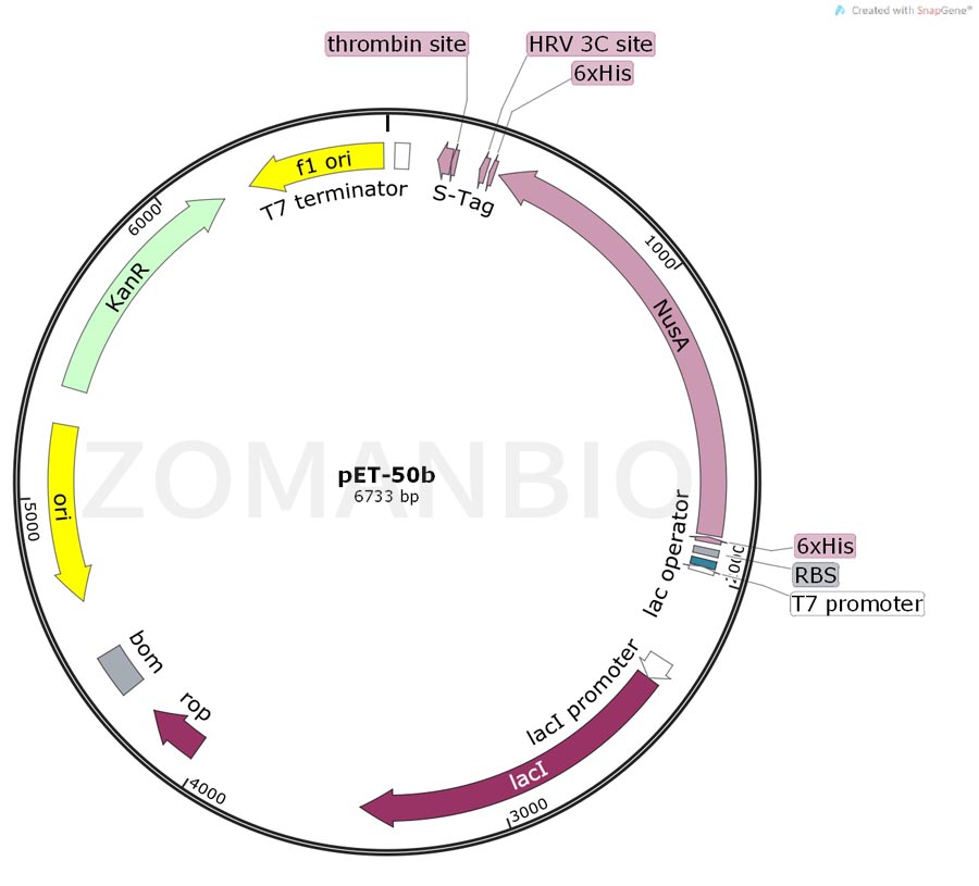 pET50b載體攜帶有N端的Nus標簽和His純化標簽,緊跟著這些標簽的有一個HRV3C蛋白酶切位點。這個HRV3C蛋白酶切位點能夠特異性的高效切割 “LEVLFQ↓GP”氨基酸序列,酶活力在低溫下很強。pET-50b(+)載體上還含有一個可選擇的C端Thrombin蛋白酶切位點和S標簽序列。