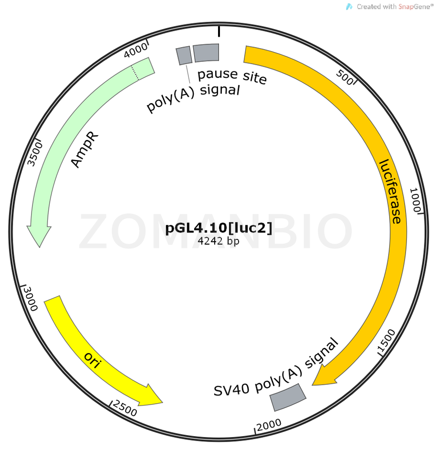 The pGL4.10[luc2] Vectorencodes the luciferase reporter gene luc2 (Photinus pyralis) and is designed for high expression and reduced anomalous transcription. The pGL4 Vectors are engineered with fewer consensus regulatory sequences and a synthetic gene, which has been codon optimized for mammalian expression.