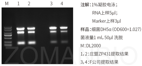 以上參考圖分別取50mg燕麥葉片,20mg小鼠肝臟和1ml細(xì)菌DH5α菌液各數(shù)份,組織進(jìn)行液氮研磨處理,菌液離心收集細(xì)胞后,分別加入1ml Zomanbio RNApure 和 T、I公司相應(yīng)產(chǎn)品,按各自說明書進(jìn)行RNA提取。洗脫體積分別為80μl、100μl、60μl。RNA電泳上樣量分別為5μl,1%瓊脂糖凝膠電泳。