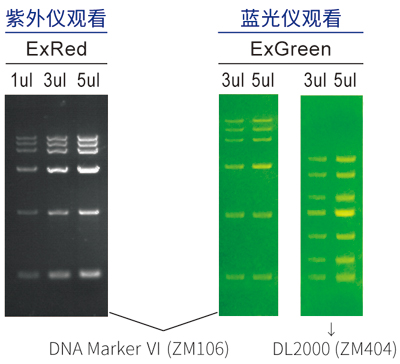 ■ ExGreen核酸電泳染料 (10,000× DMSO溶) ★ 通過以下測試,均證明無致癌風險 1.小鼠骨髓微核測試;2.染色體畸變測試; 3.艾姆斯測試;4.乳膠或腈類手套滲透測試。 ★ 適用于各種大小片段的電泳染色, 條帶整齊性遠高于普通花菁類染料, 對核酸遷移的影響較小。 | ![]() |