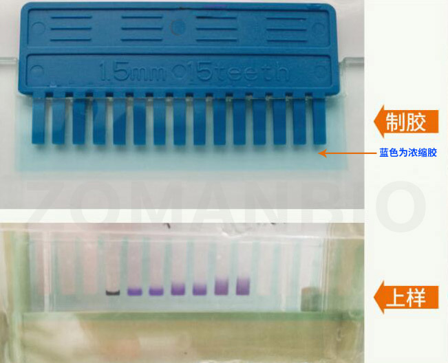超快SDS-PAGE凝膠制備試劑盒(ZD304C)作為一款基礎(chǔ)的制膠產(chǎn)品,自上市起便廣受客戶(hù)好評(píng)。為增加客戶(hù)使用體驗(yàn),產(chǎn)品進(jìn)一步升級(jí),在試劑盒組成中新添加了藍(lán)色染料,可將濃縮膠染成藍(lán)色,使得樣孔清晰可見(jiàn)(如圖1),極大方便上樣操作。