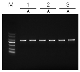 ![]() | 注解:三個月穩(wěn)定性實(shí)驗(yàn)結(jié)果圖 柑橘內(nèi)參基因GAPDH 1kb擴(kuò)增結(jié)果 RNA使用量為50 ng 1:4℃保存 2:37℃保存 3:-20℃保存 M:莊盟DL2000(3μl點(diǎn)樣) |