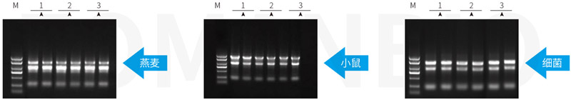 以上參考圖分別取50mg燕麥葉片,20mg小鼠肝臟和1ml細(xì)菌DH5α菌液各數(shù)份,組織進(jìn)行液氮研磨處理,菌液離心收集細(xì)胞后,分別加入1ml Zomanbio RNApure 和 T、I公司相應(yīng)產(chǎn)品,按各自說明書進(jìn)行RNA提取。洗脫體積分別為80μl、100μl、60μl。RNA電泳上樣量分別為5μl,1%瓊脂糖凝膠電泳。