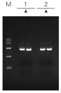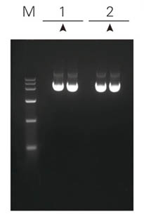注解:PUC19質(zhì)粒 菌液OD600=1.530 1:ZP101 2:ZPK101 M:莊盟DNA MarkerⅥ(5μl點樣) Marker與樣品均為5μl點樣 | 注解:PET-15B質(zhì)粒(中低拷貝) 菌液OD600=1.824 1:ZP101 2:ZPK101 M:莊盟DNA MarkerⅥ(5μl點樣) Marker與樣品均為5μl點樣 | 注解:8K質(zhì)粒 菌液OD600=1.167 1:ZP101 2:ZPK101 M:莊盟DNA MarkerⅥ(5μl點樣) Marker與樣品均為5μl點樣 | 注解:15K質(zhì)粒 菌液OD600=1.553 1:ZP101 2:ZPK101 M:莊盟DNA MarkerⅥ(5μl點樣) Marker為5μl樣品為2μl點樣 |