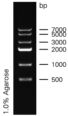 本產(chǎn)品是由6條線性雙鏈DNA條帶組成,適用于瓊脂糖凝膠電泳中DNA條帶的分析。產(chǎn)品中已含有1×loading buffer,可根據(jù)實(shí)驗(yàn)需要,直接取2-5μl電泳,使用方便,電泳圖像清晰。6條帶的大小分別為500,1000,2000,3000,5000,7000bp。其中2000bp條帶約為100ng/5μl,顯示加亮帶,其余條帶濃度約為50ng/5μl。