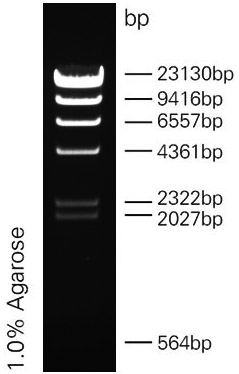 本產(chǎn)品是由λ DNA經(jīng)HindIII完全酶切而成,適用于瓊脂糖凝膠電泳中DNA條帶的分析。產(chǎn)品中已含有1×loading buffer,可直接上樣,使用方便。8條帶的大小分別為125,564,2027,2322,4361,6557,9416,23130bp。