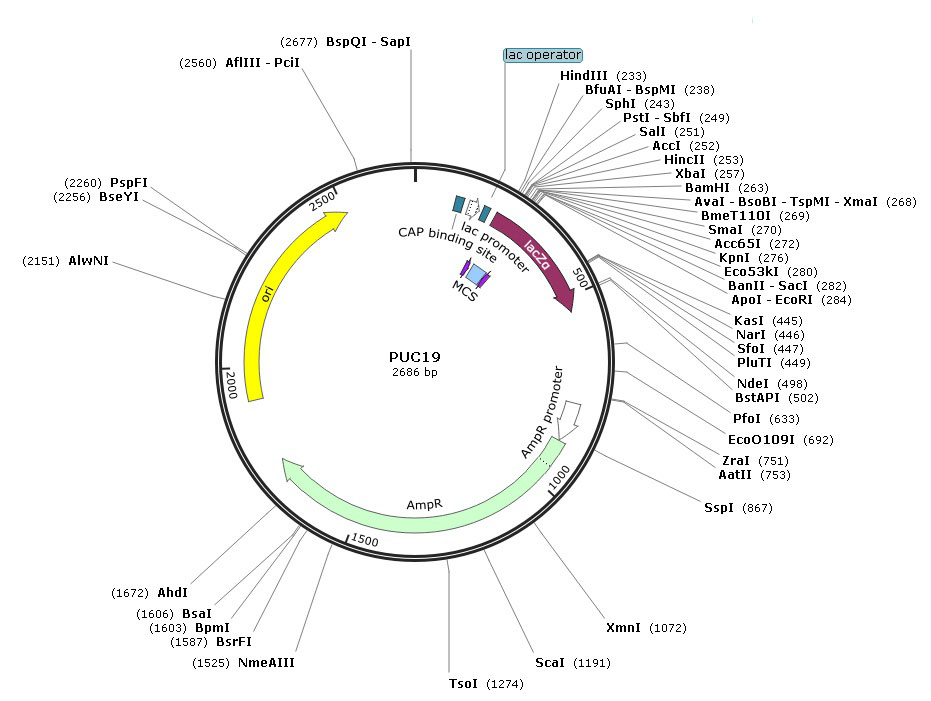 pUC18 和 pUC19 大小只有 2686bp ,是最常用的質(zhì)粒載體,其結(jié)構(gòu)組成緊湊,幾乎不含多余的 DNA片段,GenBank注冊號為 L08752(pUC18)和 X02514(pUC19)。由 pBR322 改造而來,其中 lacZ (MSC)來自 M13mp18/19 。這兩個質(zhì)粒的結(jié)構(gòu)幾乎是完全一樣的,只是多克隆位點的排列方向相反。這些質(zhì)粒缺乏控制拷貝數(shù)的 rop 基因,因此其拷貝數(shù)達(dá) 500-700 。 pUC 系列載體含有一段 lacZ 蛋白氨基末端的部分編碼序列,在特定的受體細(xì)胞中可表現(xiàn) α-互補(bǔ)作用。因此在多克隆位點中插入了外源片段后,可通過 α-互補(bǔ)作用形成的藍(lán)色和白色菌落篩選重組 質(zhì)粒。pUC18、pUC19載體適合于DNA片段的克隆、進(jìn)行DNA測序、對外源基因進(jìn)行表達(dá)等。由于在lacZ領(lǐng)域中含有多克隆位點,因此在以lacZ缺欠細(xì)胞作為宿主 (如:JM109等) 進(jìn)行轉(zhuǎn)化后,在含有IPTG、X-Gal 的平板培養(yǎng)基上進(jìn)行培養(yǎng)時,可以很容易地通過藍(lán)白篩選,判斷載體中有無DNA片段的插入。同時還可以通過載體上的lac promoter表達(dá)外源基因,對插入載體中的DNA片段進(jìn)行測序等。進(jìn)行DNA測序時,可以方便地使用M13系列的通用引物。