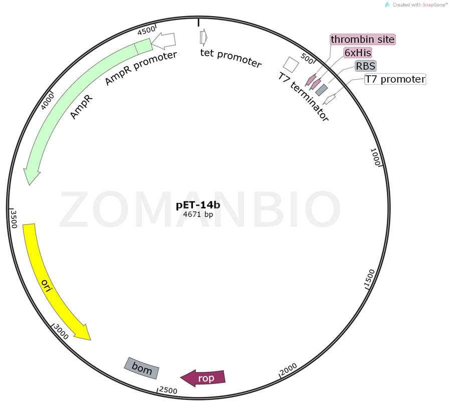 The pET-14b vector carries an N-terminal His?Tag? sequence followed by a thrombin site and three cloning sites. Unique sites are shown on the circle map. Note that thesequence is numbered by the pBR322 convention, so the T7 expression region is reversed on the circular map. The cloning/expression region of the coding strand transcribed by T7 RNA polymerase is shown below.