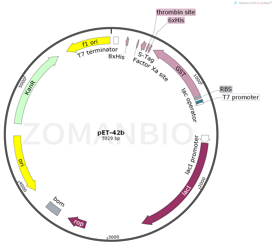 pET42系列載體是用來進行克隆和高水平表達含有220個氨基酸的GST融合純化標簽的蛋白表達載體。
