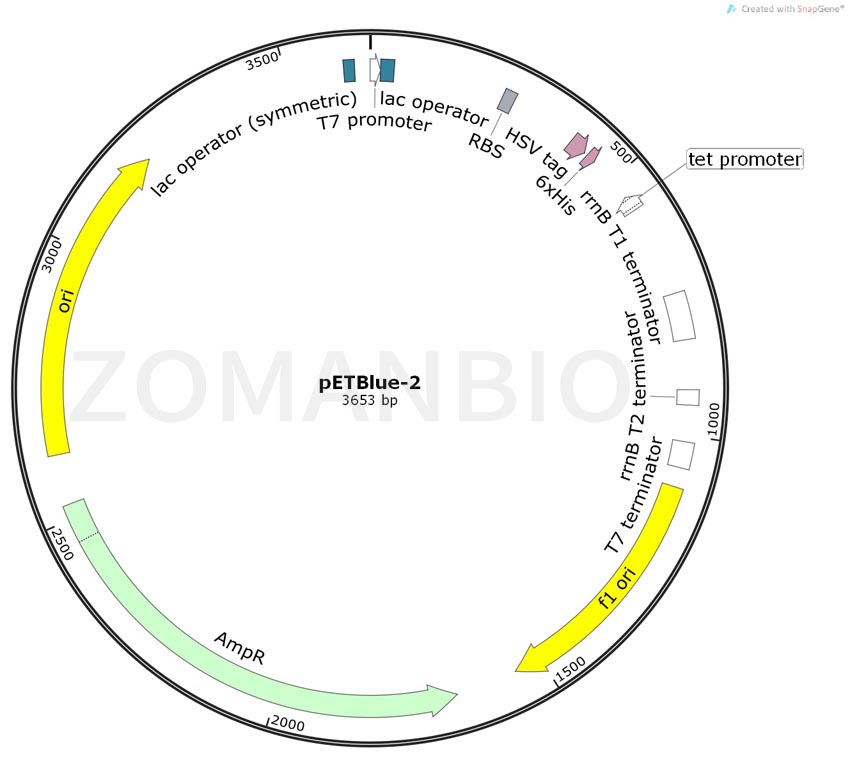 pETBlue-2是一個大腸桿菌pET系列表達(dá)質(zhì)粒。The pETBlue?-2 vector is designed to identify recombinants by traditional blue/white screening while also allowing T7lac promoter based expression of target genes. Screening is independent of expression because the T7lac expression promoter is in an opposed orientation relative to the E. coli promoter that mediates blue/white screening. pETBlue-2 defines the open reading frame and inserts must be cloned in-frame if expression is desired. The vector features an expanded multiple cloning site (MCS) and optional C-terminal HSV?Tag? and His?Tag? sequences. The sequence is numbered from the first base of the T7 promoter sequence.