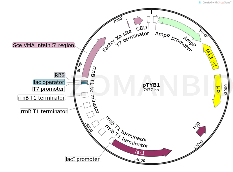 The pTYB1 is an E. coli vector created for fusion protein expression and purification. A target gene can be inserted into the the ORF by use of the MCS upstream of the Sce VMA intein. The NdeI site in the MCS has the initiator sequence ATG that enables translation of the ORF. The chitin-binding domain(CBD) downstream of the intein results in a target protein-intein with C-terminal chitin beads that facilitate protein purification. Release of the protein is induced by the thiol cleavage activity of the intein.