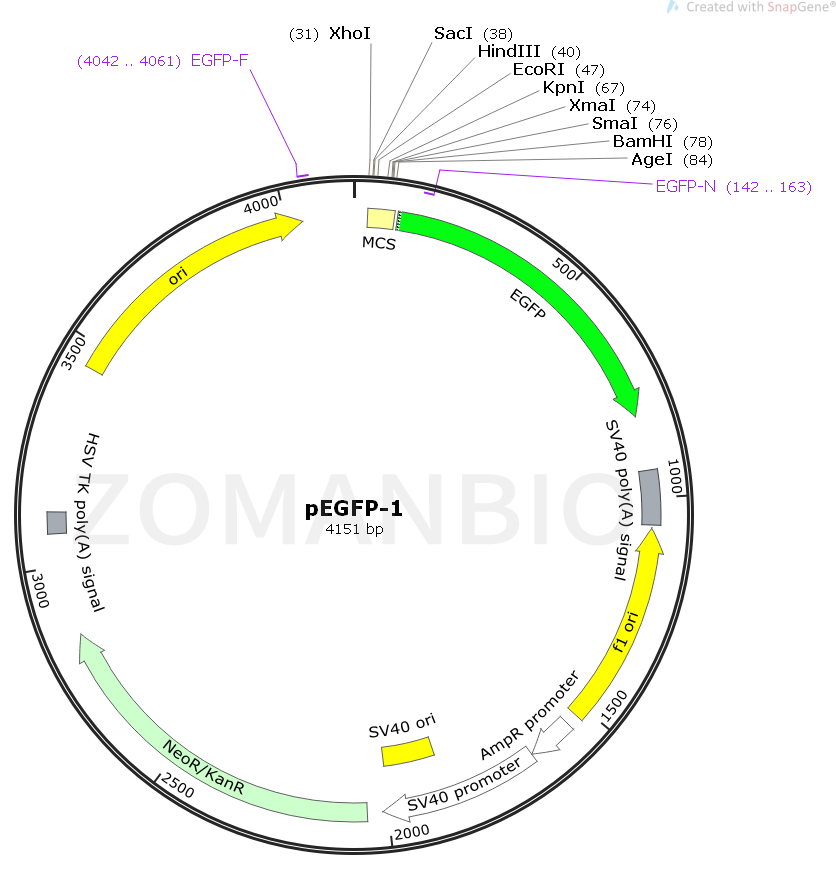 pEGFP-1編碼野生型GFP(1-3)的紅移型變體,其已經(jīng)針對更明亮的熒光和哺乳動物細(xì)胞中更高的表達(dá)進(jìn)行了優(yōu)化。(激發(fā)最大值= 488nm;發(fā)射最大值= 507nm)pEGFP-1骨架還提供了用于在大腸桿菌中繁殖的pUC起始點(diǎn)和用于單鏈DNA生產(chǎn)的f1起源。