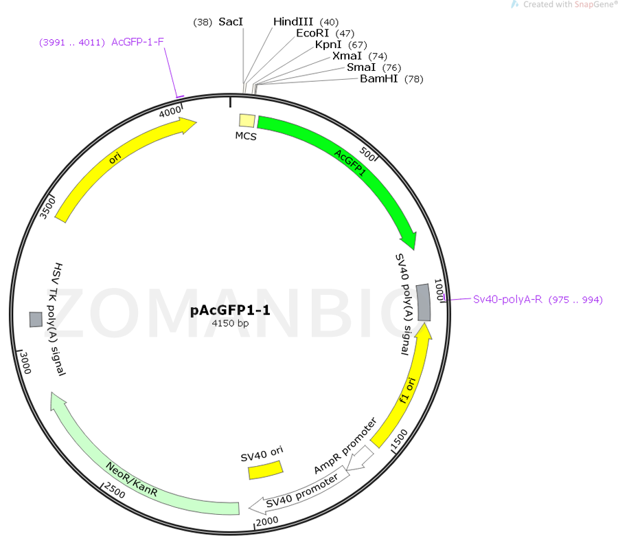 pAcGFP1-1質(zhì)粒是 AcGFP的衍生物,來(lái)自Aequorea coerulescens。 AcGFP1已經(jīng)優(yōu)化了更亮的熒光。(激發(fā)最大值= 475nm;發(fā)射最大值= 505nm)AcGFP1基因的編碼序列含有沉默堿基變化,其對(duì)應(yīng)于人類(lèi)密碼子使用偏好。