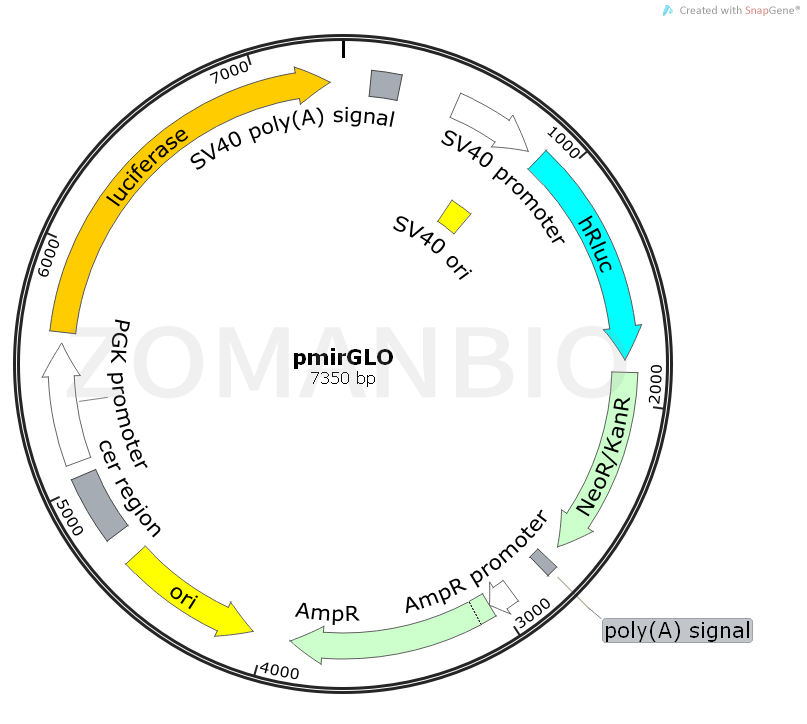 The pmirGLO Dual-Luciferase miRNA Target Expression Vector(a–d) is designed to quantitatively evaluate microRNA (miRNA) activity by the insertion of miRNA target sites 3′ of the firefly luciferase gene (luc2). These target sites can be introduced by cloning putative miRNA binding sites alone, or the 3′ untranslated region (UTR) of a gene of interest, to study the influence of these sites on transcript stability and activity. Firefly luciferase is the primary reporter gene; reduced firefly luciferase expression indicates the binding of endogenous or introduced miRNAs to the cloned miRNA target sequence. This vector is based on Promega dual-luciferase technology, with firefly luciferase (luc2) used as the primary reporter to monitor mRNA regulation and Renilla luciferase (hRluc-neo) acting as a control reporter for normalization and selection.
