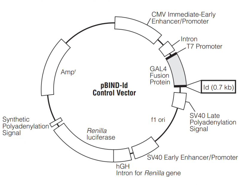 The protein product of the Id cDNA sequence in the pBIND-Id Vector is known to interact with the protein product of the MyoD cDNA sequence in the pACT-MyoD Vector.