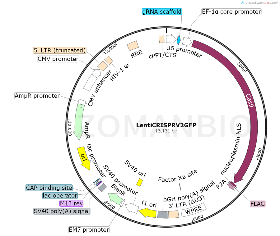 pLentiCRISPRV2GFP是一個(gè)哺乳細(xì)胞Cas9和gRNA表達(dá)質(zhì)粒。