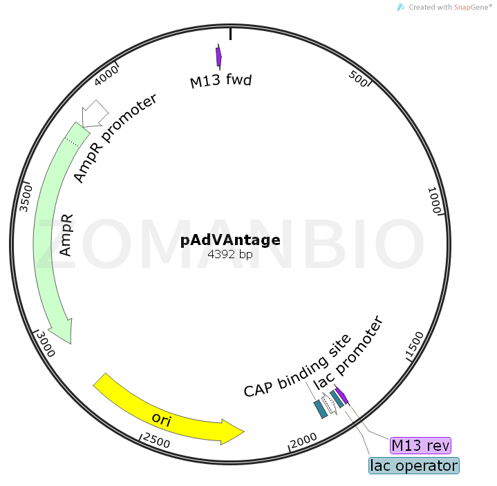 The use of pAdVAntage vectors were transfected into mammalian cells can promote the initiation of translation to enhance the instantaneous protein expression in many cell types.