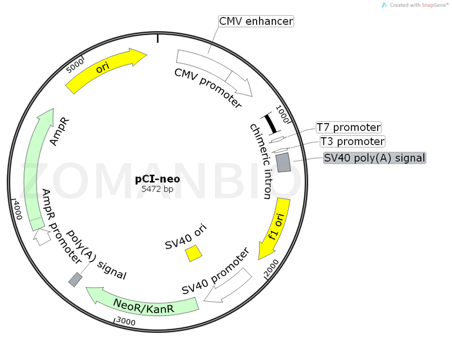 pCI-neo Mammalian Expression Vector(pCI-neo 哺乳動物表達(dá)載體) 攜帶有人類巨細(xì)胞病毒(CMV) 的即刻早期增強(qiáng)子/ 啟動子區(qū)域,來促進(jìn)哺乳動物細(xì)胞中插入克隆DNA 的組成型表達(dá)。此載體也帶有新霉素磷酸轉(zhuǎn)移酶基因, 一種哺乳動物細(xì)胞的選擇性標(biāo)志物。通過G-418 抗性篩選轉(zhuǎn)染細(xì)胞,pCI-neo 載體能夠用于瞬時或穩(wěn)定表達(dá)。