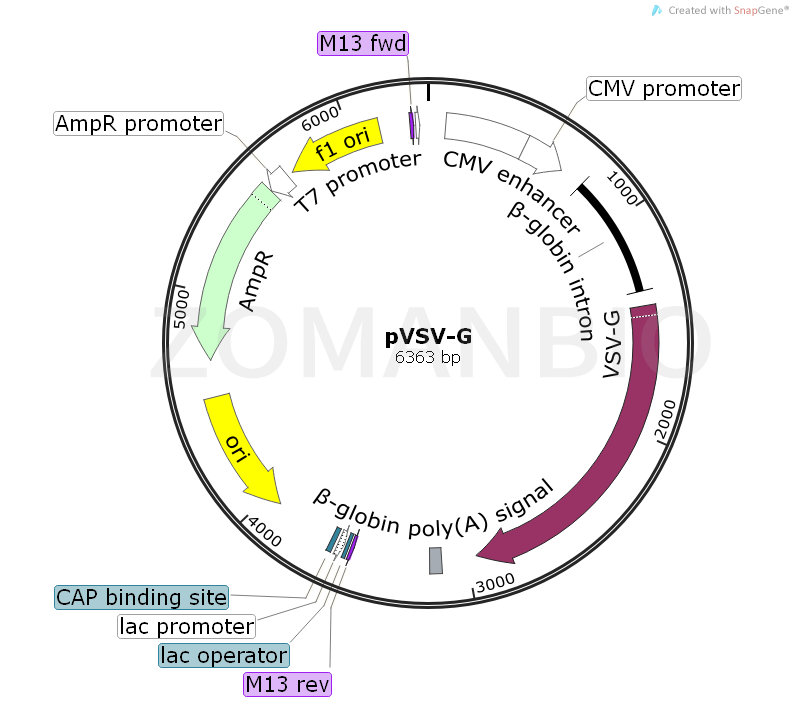 pVSV-G表示G蛋白的水泡性口炎病毒(VSV-G)的控制下CMV立即早期啟動(dòng)子。VSV-G用于假M(fèi)oloney Murine Leukenia病毒(MMLV)-介導(dǎo)病毒進(jìn)入通過(guò)逆轉(zhuǎn)錄病毒載體VSV-G與磷脂。靶細(xì)胞膜的組成部分,并促進(jìn)病毒和細(xì)胞膜的融合。利用不需要的細(xì)胞表面受體,可以作為一個(gè)替代病毒包膜蛋白。pVSV-G向量包括靜脈輸液,以提高合成的內(nèi)含子的mRNA的穩(wěn)定性,復(fù)制和氨芐青霉素抵抗細(xì)菌的Col E1起源(Ampr)基因的傳播和細(xì)菌中抗生素的選擇。