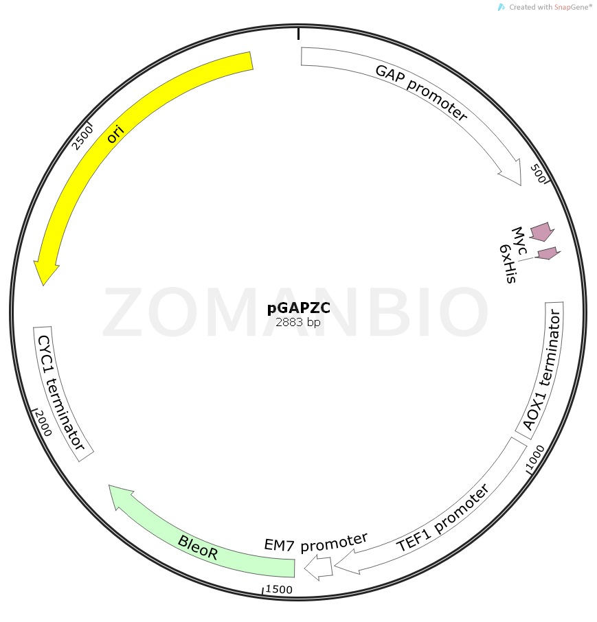 pGAPZ A,B,和C載體(2.9 KB)和pGAPZα,B,和C(3.1 KB)載體使用GAP啟動子在畢赤酵母中穩(wěn)定表達重組蛋白。重組蛋白表達為為帶有C-末端myc抗原表位和C端His標簽的融合蛋白。此外,pGAPZα表達的融合蛋白在N-端帶有釀酒酵母(Saccharomyces cerevisiae)的α-因子分泌信號肽。這兩個系列的載體都提供三個不同讀碼框的載體,以方便克隆的帶有C-端標簽和/或N-末端分泌信號肽的載體中。這些載體是基于顯性選擇標記,Zeocin(博萊霉素)的篩選標記可以同時使用于畢赤酵母和大腸桿菌。