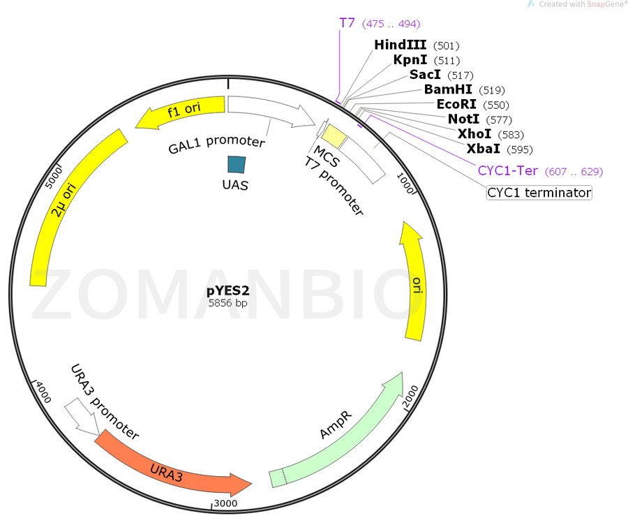 pYES2的是一個5.9 kb的載體,設(shè)計用來在釀酒酵母(Saccharomyces cerevisiae)中誘導(dǎo)表達(dá)重組蛋白。載體的特點在于基因插入載體的構(gòu)建簡單,以及能夠使用原養(yǎng)型尿嘧啶進(jìn)行轉(zhuǎn)化株的篩選。