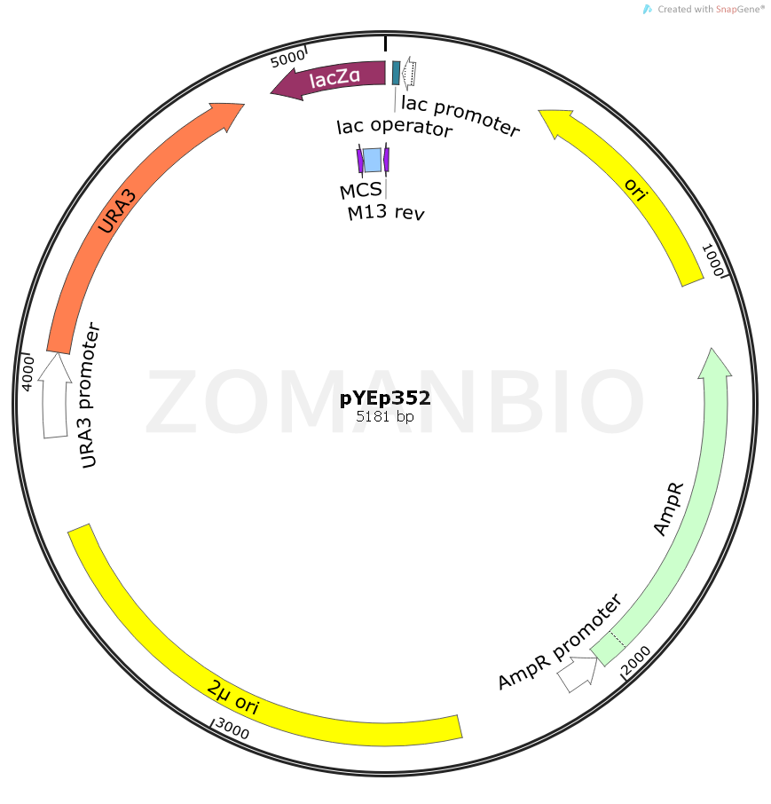 Restriction digests of the clone give the following sizes (kb): BamHI--5.3; XbaI--5.3; PstI--5.3; HindIII--5.3.This is a Escherichia coli/yeast episomal shuttle vector with multiple restriction sites for cloning.Constructed by filling in and blunt-end ligating pUC18 linearized at NdeI, a 1.4 kb RsaI fragment of the 2 micron circle, and a 1.1 kb HindIII/SmaI fragment containing URA3. A XbaI site in 2u and a PstI site in URA3 were removed.The yeast genomicsequence is in nt 286-1383 (where the A of the ATG of lacZ' is number 1), the 2 micron sequence goes from nt 1384-2768, and pUC18 includes nt 2769-285.
