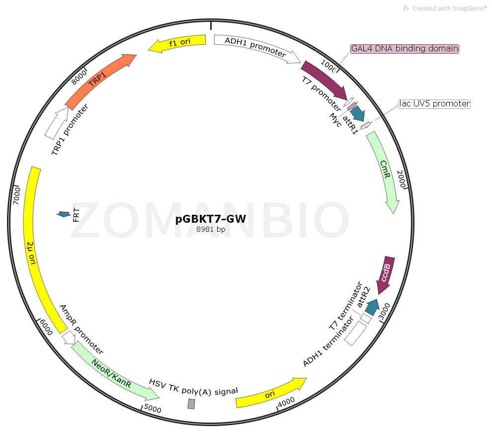 pGBKT7-GW質(zhì)粒是一個(gè)用GateWay方法做克隆的酵母雙雜交質(zhì)粒。