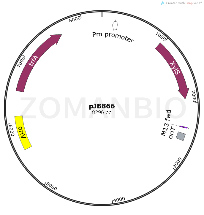 pJB866是一個革蘭氏陰性菌廣宿主表達載體,Pm啟動子驅(qū)動目的基因的表達。